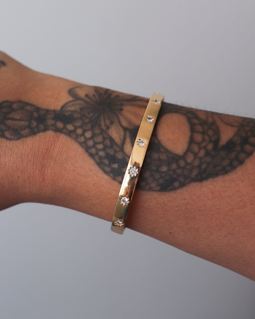 O brilho das pedrinhas faz com que ele seja incrível usado sozinho, mas também fica super estiloso quando combinado com pulseiras mais finas ou até outro bracelete. Um acessório versátil, moderno e que transforma qualquer produção sem esforço. Dica: combine com nosso Relógio Lily e Pulseira Blair, fica impecável!