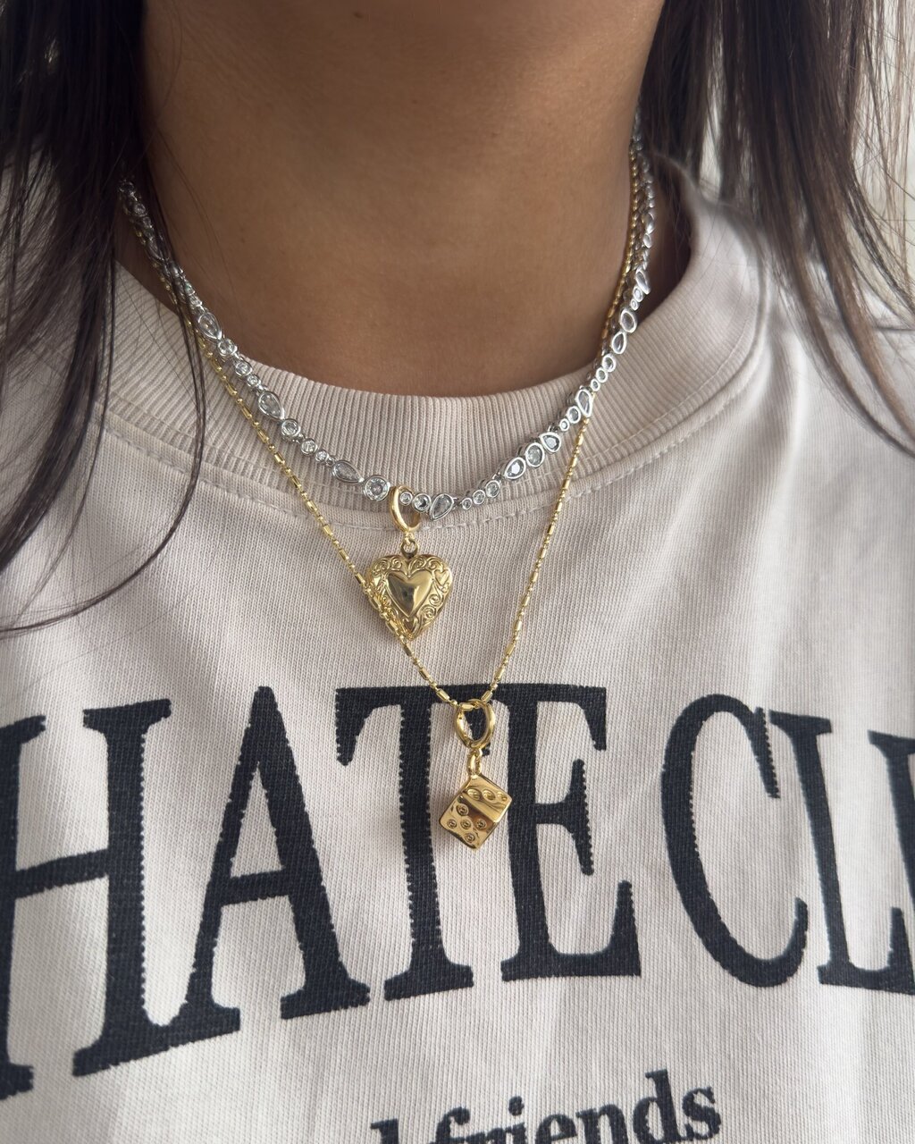 O Charm Dado é feito para quem ama imprimir personalidade em cada detalhe. Ele vem com argolinha de click — prática e segura — que abre e fecha, permitindo que você use a peça em colares, pulseiras, brincos e até no cadarço do tênis.
