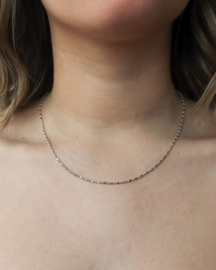 O Colar Kiara é delicaoa e cheio de personalidade. Com pequenas bolinhas ao longo de seu comprimento, ela traz um toque sutil de charme e modernidade, perfeita para quem gosta de acessórios que se destacam sem esforço. É perfeito pra ser usado com nossos charms